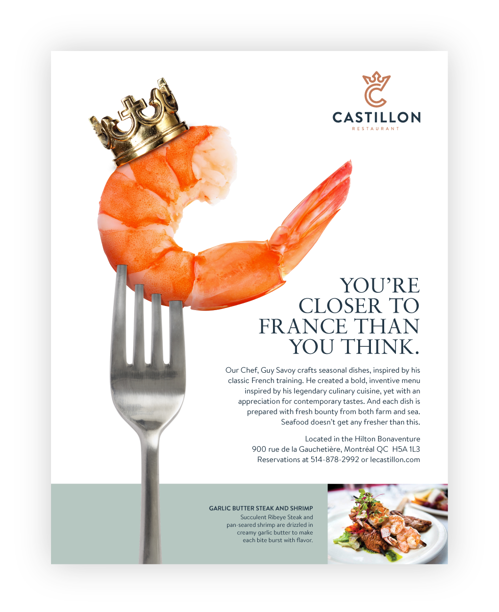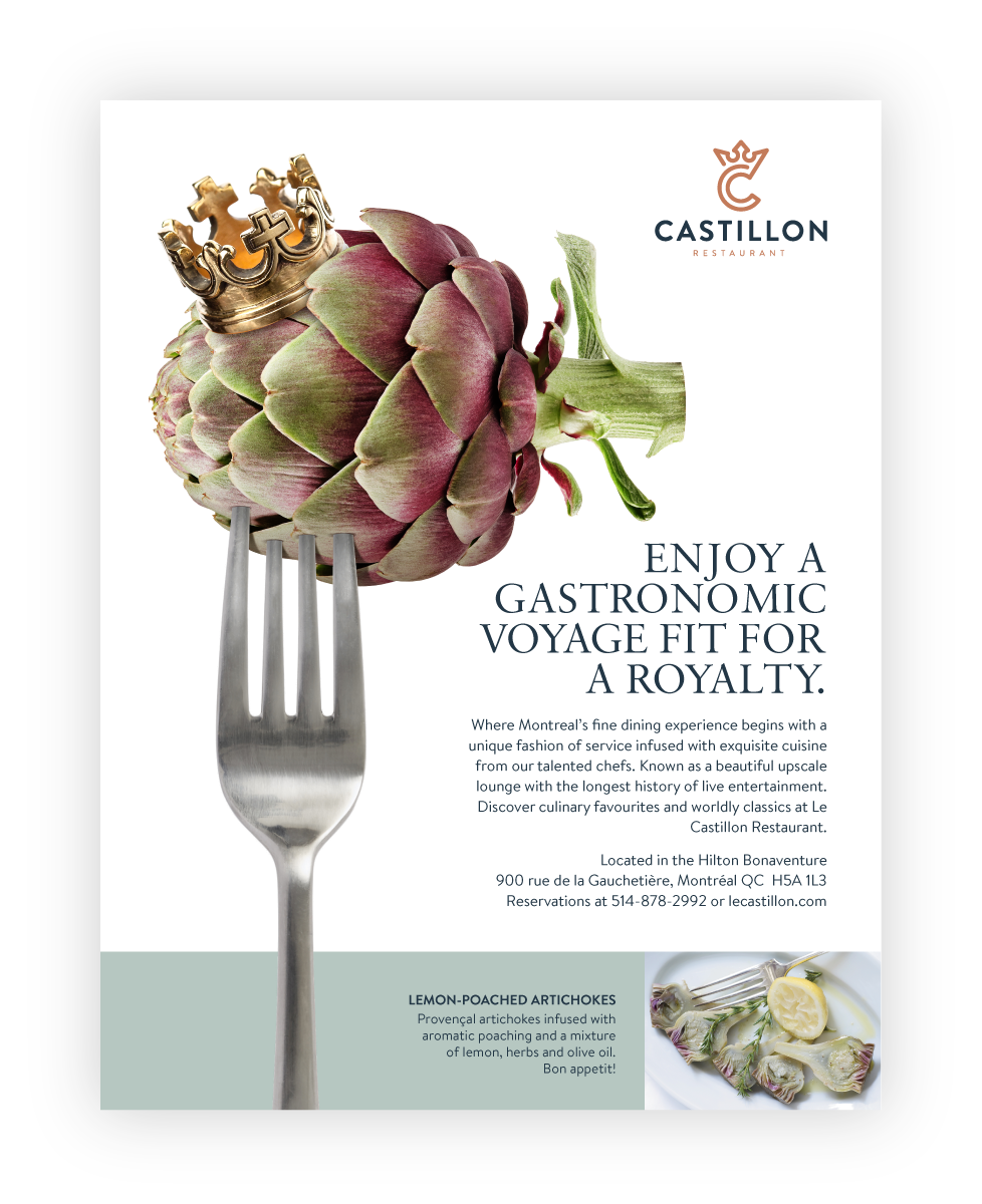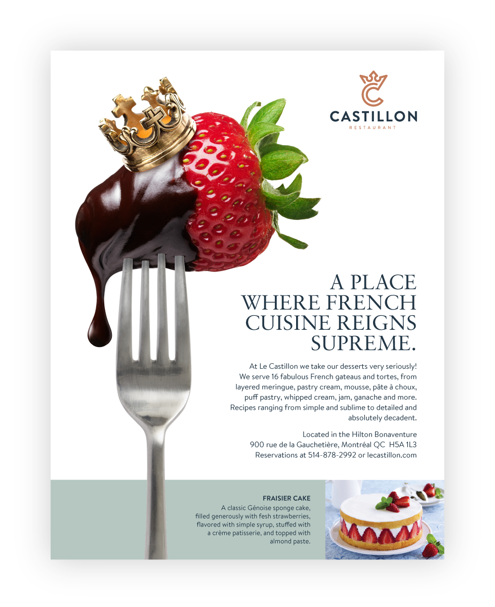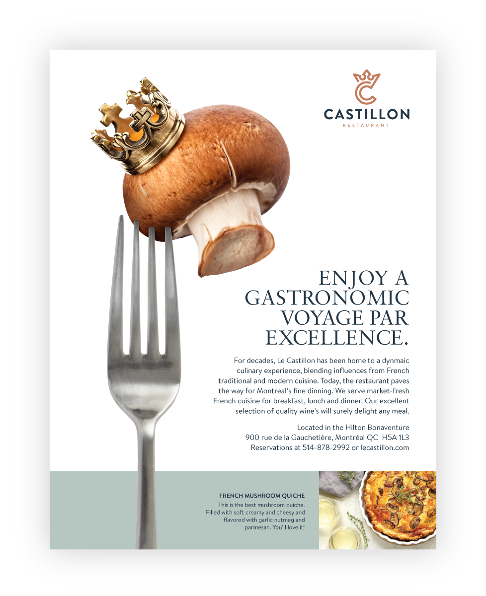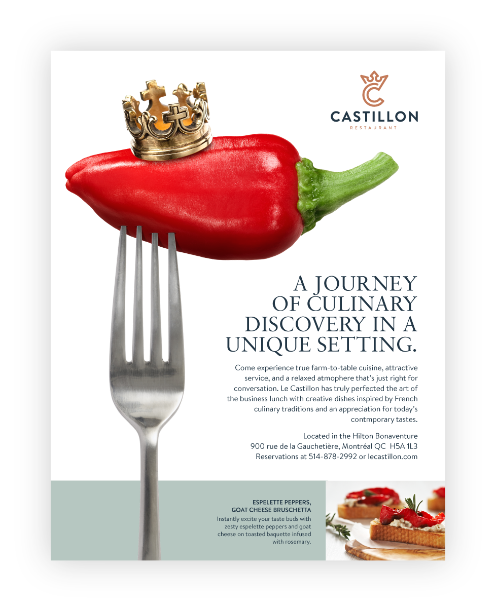 This Montreal food mecca, whose reputation has been ever on the rise since its inception in the 80’s. We proposed a stylishly elegant website built on contrasts: between light and dark, clean typography and complex cuisine, capped by an attractive logo design. The messages declare the restaurant as a premier choice for French cuisine, playing the fork metaphor along with sensuousness dishes fit for royalty. The ads, prepare visitors to expect something different and special, not just a dining room — sensuousness atmosphere amongst its rooftop gardens, not your typical restaurant.