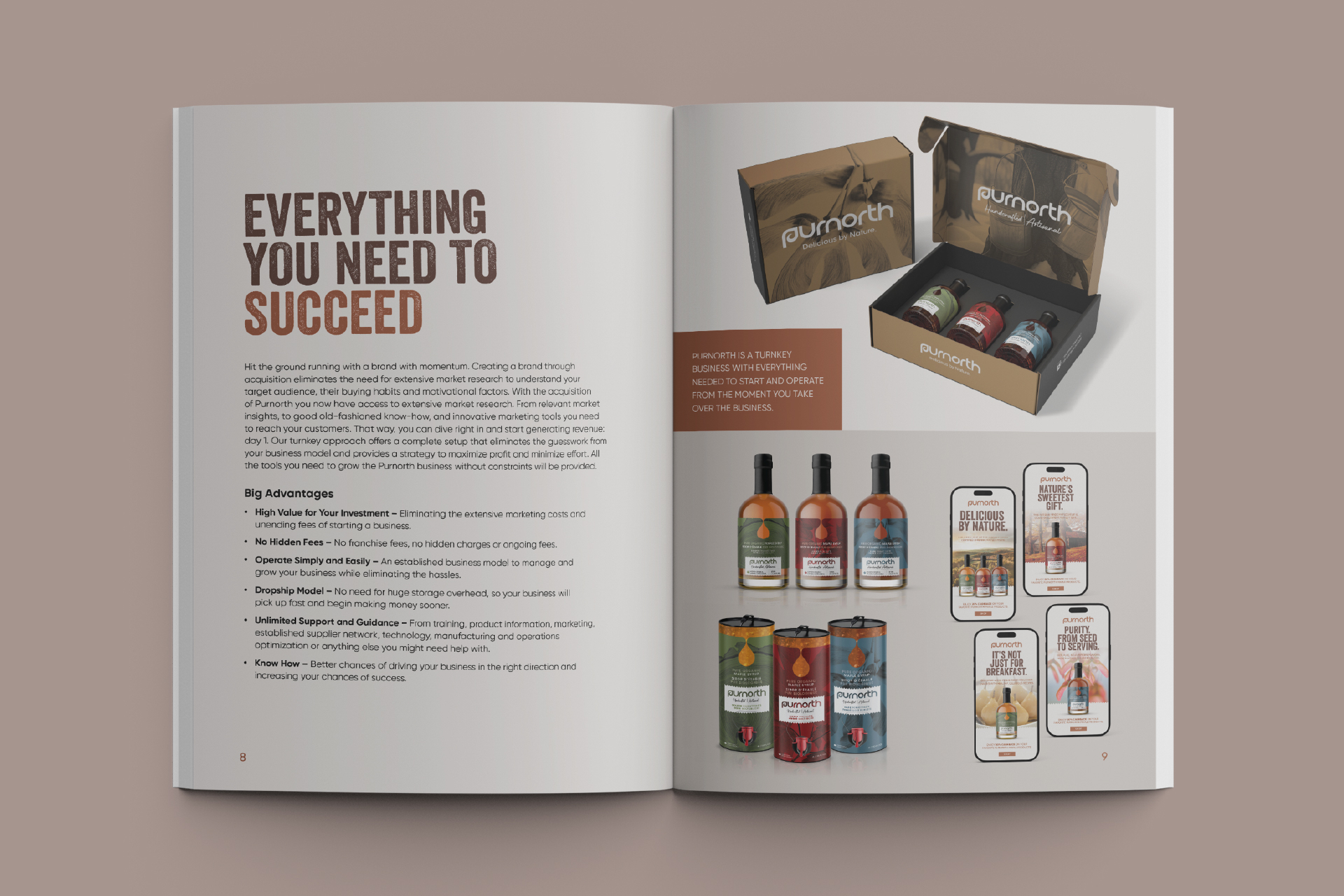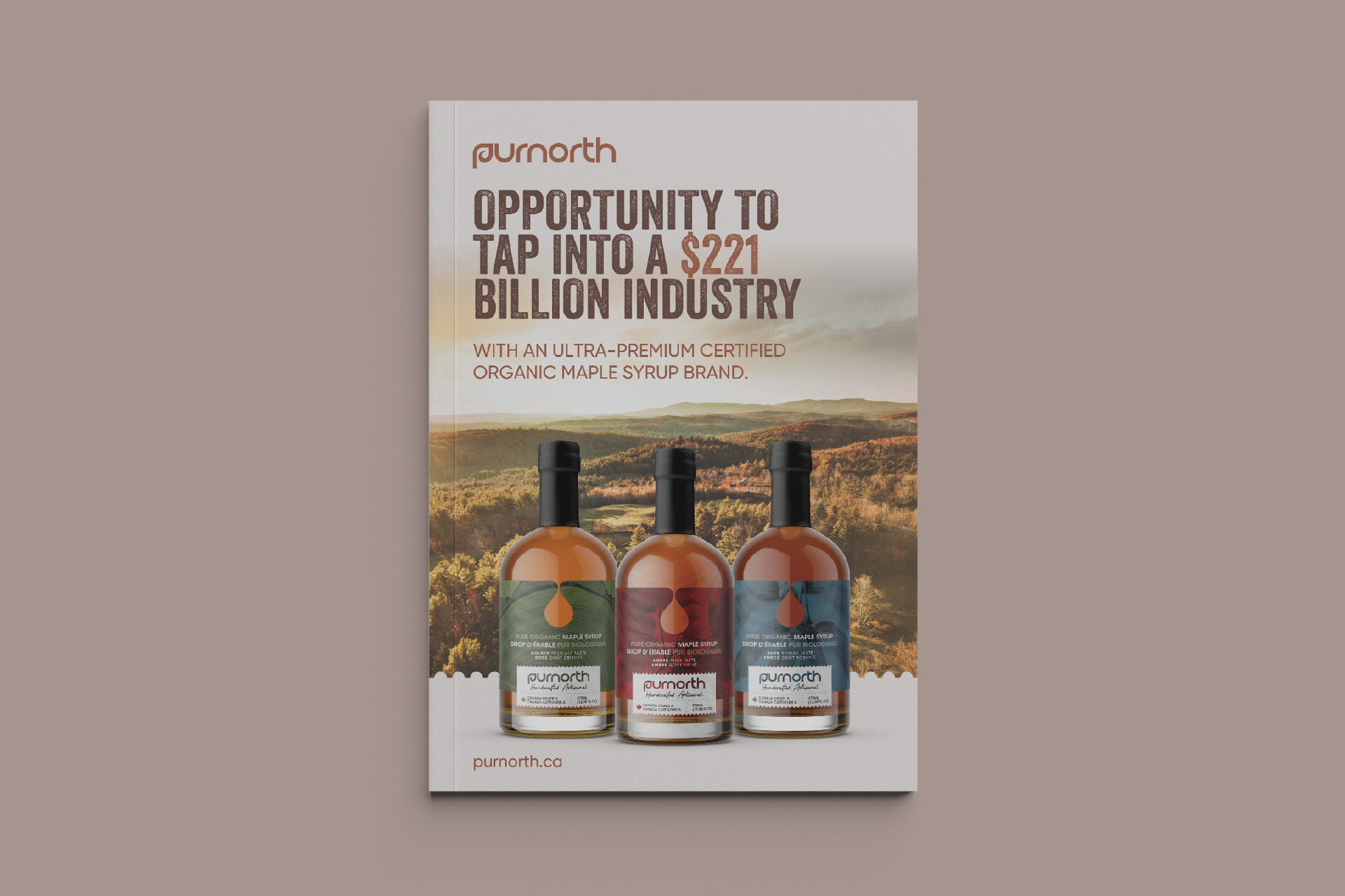 From tree to bottle, the art of crafting maple syrup is a meticulous science that requires both fervor and precision. Purnorth was conceived as an in-house brand for I-D Foods Canada, with the ambition to create an ultra-premium organic maple syrup that could compete with numerous organic offerings in the marketplace. We sourced our syrup from a company committed to ecologically sound practices, resulting in one of the finest organic maple syrups on the globe, celebrated for its exceptional flavor profile. The Purnorth brand name is a fusion of two words: “Pure” and “North,” which encapsulates its essence and resonates with its target audience. The logomark is distinctive and easily recognizable, ensuring that the brand name remains memorable to the public. The identity suite, encompassing imagery and complementary creative elements, is meticulously designed to engage consumers and foster brand acceptance in their minds..