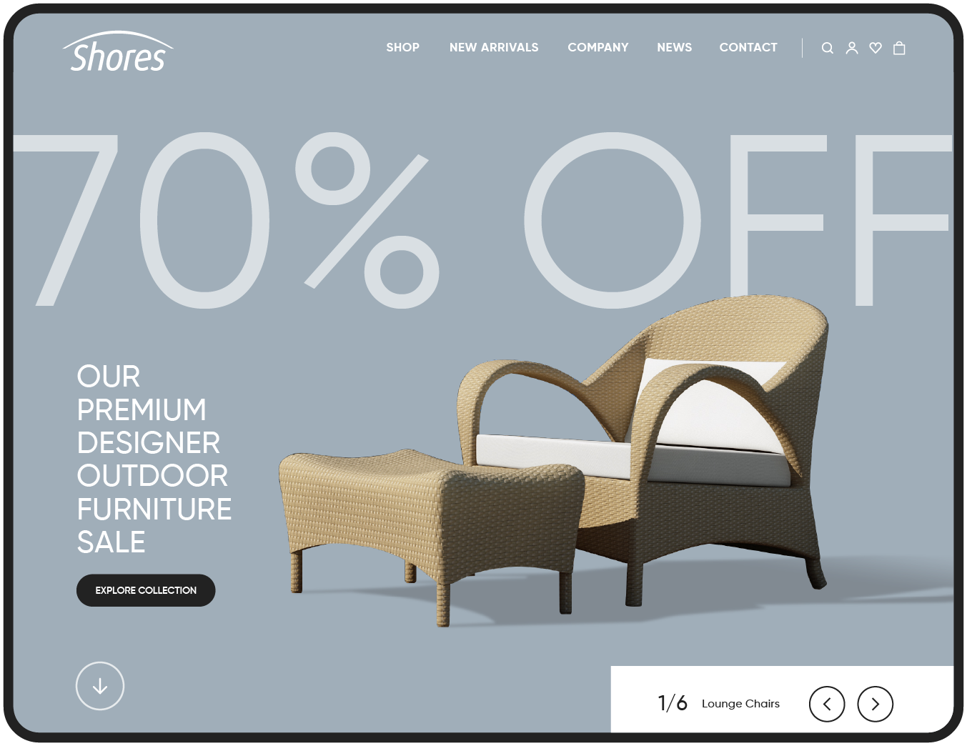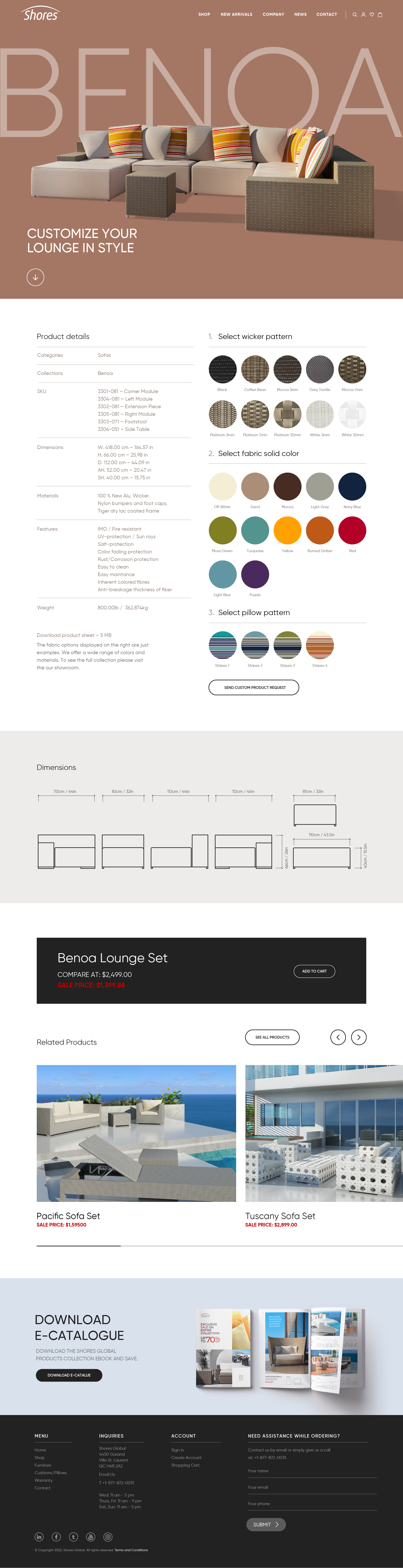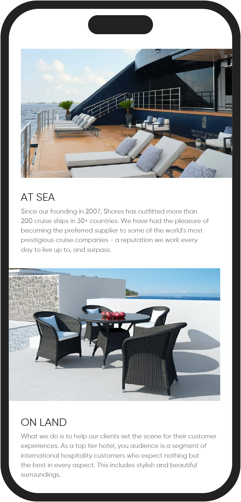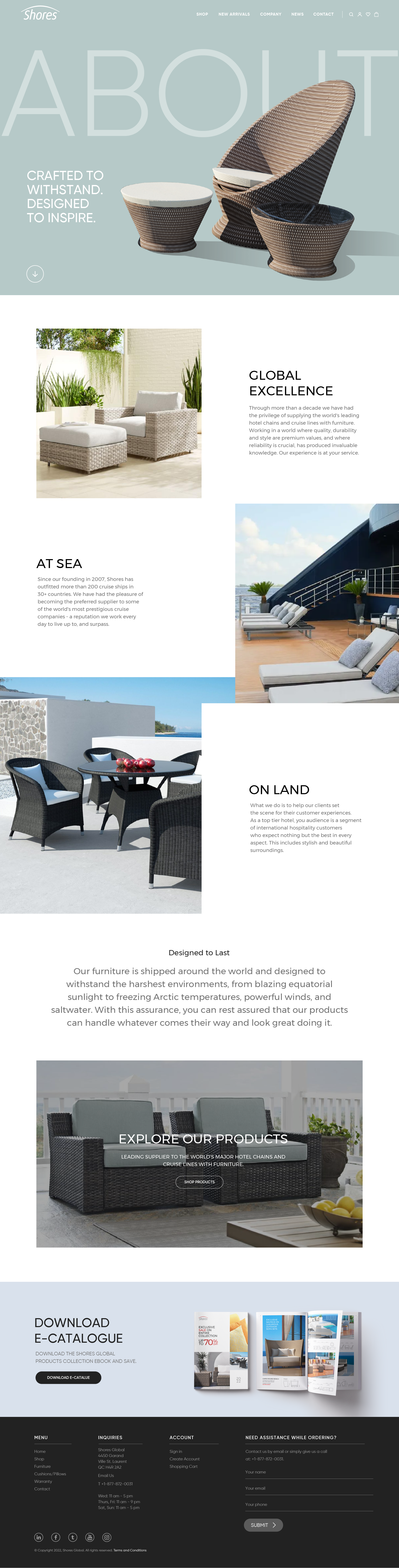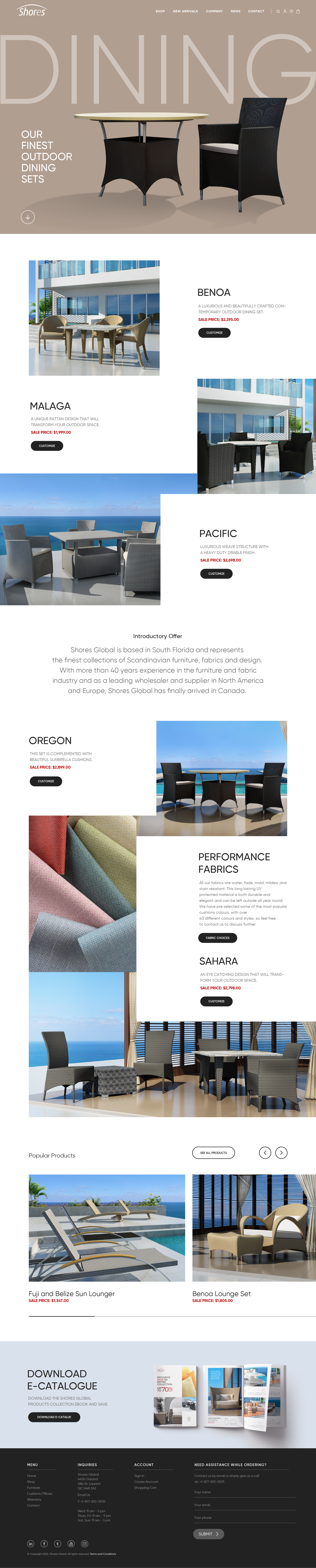 Objective: Shores Global, based in Montreal, Canada, is a trusted leader with over 20 years of experience furnishing luxury cruise lines and hotels worldwide. Specializing in high-end, marine-grade furniture for hospitality and residential spaces, the company needed a digital solution to move its seasonal warehouse inventory efficiently. We designed and developed a sleek, intuitive website that elevated the brand experience while making it effortless for buyers to browse, inquire, and purchase.